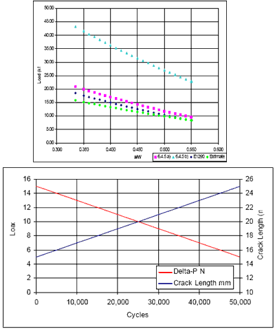 b. Decreasing Load - By calculating the load restrictions for a given crack length, it is possible to start the fatigue operation with a high load and decrease it to the limits required as the crack grows. Done carefully, this can save time in obtaining valid fatigue crack front, but it should be noted that reducing the load by too great an amount can result in the crack propagation slowing or even stopping. In this case, a given number of fatigue cycles would be needed to initiate the crack again.