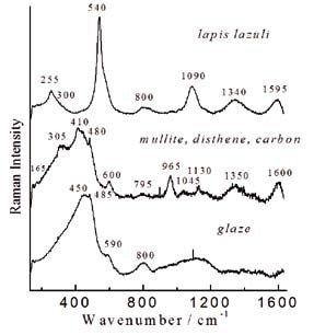 However, the ways to get a blue glaze are somewhat limited (cobalt (blue), copper in alkaline silicate (turquoise), and lapis lazuli (ultramarine blue)) irrespective of the fluxing agent. The last pigment exhibits a characteristic resonance Raman signature at 532nm laser excitation. No specific Raman signature is anticipated if the dissolution of cobalt (copper) in the glaze is in small quantities.