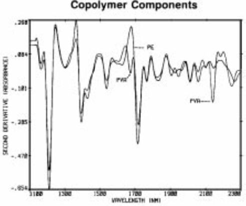 Conversion to the second derivative makes spectral comparison easier by improving the features in each spectrum (Figure 2). This math treatment has also inverted absorption peak maxima to second derivative peak minima. Isolate unique absorbance features for PE and PVA are illustrated in Figures 3 and 4.