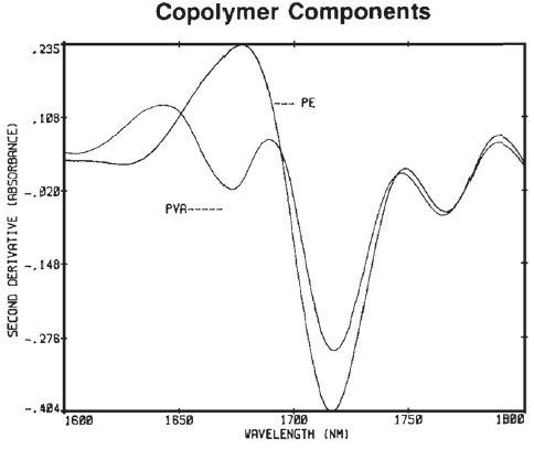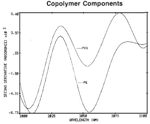 The analysis involved the collection of the NIR spectra of polyethylene (PE) and polyvinyl acetate (PVA) to identify the spectroscopic contributions of each of the copolymers, as depicted in Figure 1. The spectra of these materials appear very similar because of the characteristic broad, overlapping absorptions in this spectral region.
