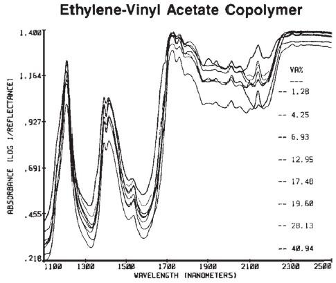 The absorbance (log 1/reflectance) spectra for ethylene vinyl acetate (EVA) copolymer pellets are delineated in Figure 5. The baseline varies drastically because of differences in the intensity of radiation scattered from the pelletized samples.