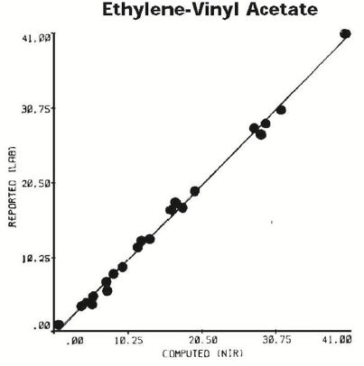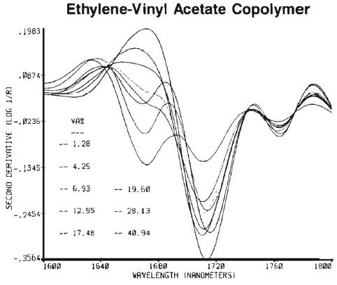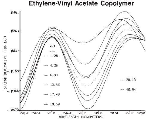The increase in the vinyl acetate absorption near 1680nm is delineated in Figure 7, while Figure 8 shows the corresponding decrease in an ethylene absorption at 2050nm. The known vinyl acetate levels and the second derivative spectra are used to perform a linear least-squares regression. The following table shows the results: