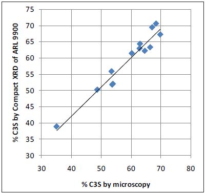 Over the production time, a series of 30 clinker samples were collected. Microscopy measurements were done in parallel on the 30 samples to obtain quantitative data for C3S, C2S, C3A and C4AF phases. A set of samples were chosen to obtain a reasonable dynamic range (working range) for concentrations of the four clinker phases. These clinker granules were ground and pressed into pellets before being measured by the ARL 9900 Series Total Cement Analyzer.