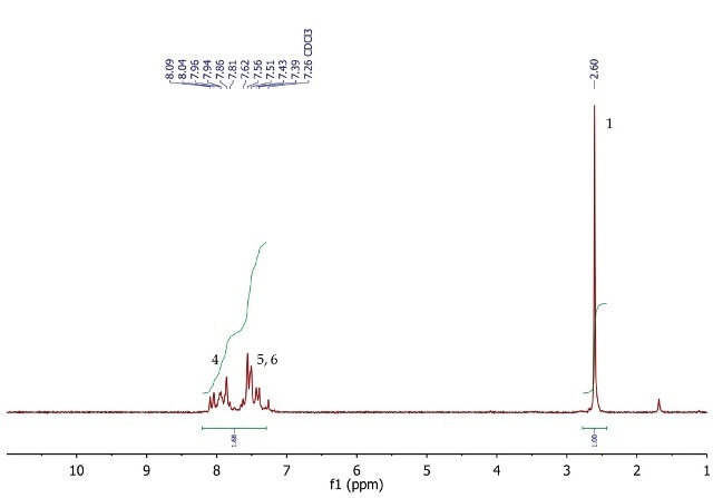 Figure 4 shows the 1H NMR spectrum of acetophenone, a singlet (3H) at 2.60ppm, corresponding to the methyl group at position 1. The five aromatic protons at positions 4, 5 and 6 resonate as a multiplet between 7.39-8.09ppm.