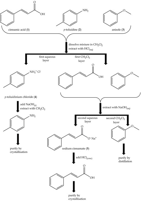 Figure 2. Flow diagram for the separation of an acid, a base and a neutral compound: cinammic acid (1), p-toluidine (2) and anisole (3).
