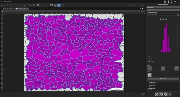 Figure 3. Grain analysis via the Planimetric method in PRECiV software. Image Credit: Evident Corporation - Industrial Microscopy