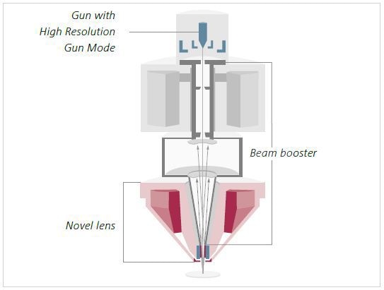 The Gemini optical column integrates the beam booster and the Gemini objective lens. The latter is a compound magnetic-electrostatic objective lens, as shown in Figure 1. When such a lens is used, the spherical and chromatic imaging aberrations decrease considerably with decreasing beam energy.