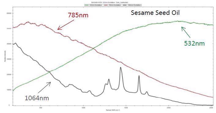 As an example, 1064 nm excitation can be used to measure the Raman spectrum of sesame seed oil, which is a dark liquid, whereas strong fluorescence covers the Raman features in the spectra acquired from 785 nm and 532 nm.