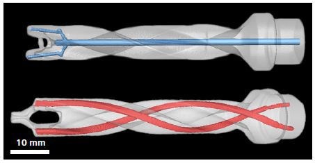 Figure 2. CT images of steel drills with cooling channels; top: conventionally produced with later machined cooling channels; bottom: additively manufactured with curved cooling channels (red).