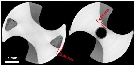 Figure 3 shows the CT sections of a 3D printed drill, allowing the size measurement of inner structures such as wall thickness and dimensions and cross-section areas of the cooling channels. This, in turn, enables quality controlling.