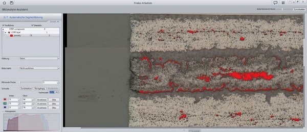 Based on the tile micrograph of the CFRP cross-section, porosity measurements are carried out with quantitative structural analysis. The image analysis wizard is used for performing threshold analysis where the pores are segmented.