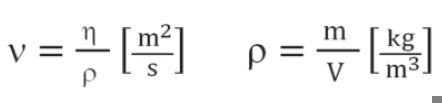Kinematic viscosity, ν, indicates the flow behavior of a substance under the influence of Earth’s gravity. It is calculated by dividing the dynamic viscosity by density (ρ), which is defined as mass per volume.
