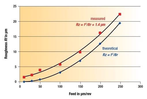 A functional correlation of the first kind is shown in Figure 4. The feed for each revolution is reverted with the peak-to-valley roughness in turning. Clear deviation between the actual and hypothetical roughness can be seen as the space between the two curves. Rt of approximately 1.5 µm seems to be the minimum roughness that could be obtained, with the groove’s irregular roughness likely to dominate.