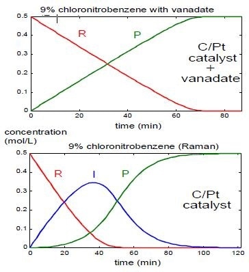 As expected in the reaction summary, an analysis of a typical reaction system involving the carbon/platinum catalyst point to the formation of hydroxylamine intermediate. When the vanadate catalyst is added to the system, there is an increase in the reaction rate. The outcomes of the Raman monitoring specify a change from the second order to zero order. This change is indicated by the lack of hydroxylamine intermediate, and is sustained by a fit of the quantified reaction rates to those expected for a reaction of zero order. Figure 2 shows a comparison of the observed kinetics for the present study.