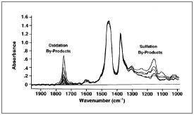 Sulfation products emerge as peaks in the IR spectrum between 1120 and 1180 cm-1, and nitration and oxidation products emerge as peaks in the IR spectrum between 1600 and 1800 cm-1. As no absolute reference standards are available for sulfation, nitration, and oxidation, the results are always compared to those of new oil.