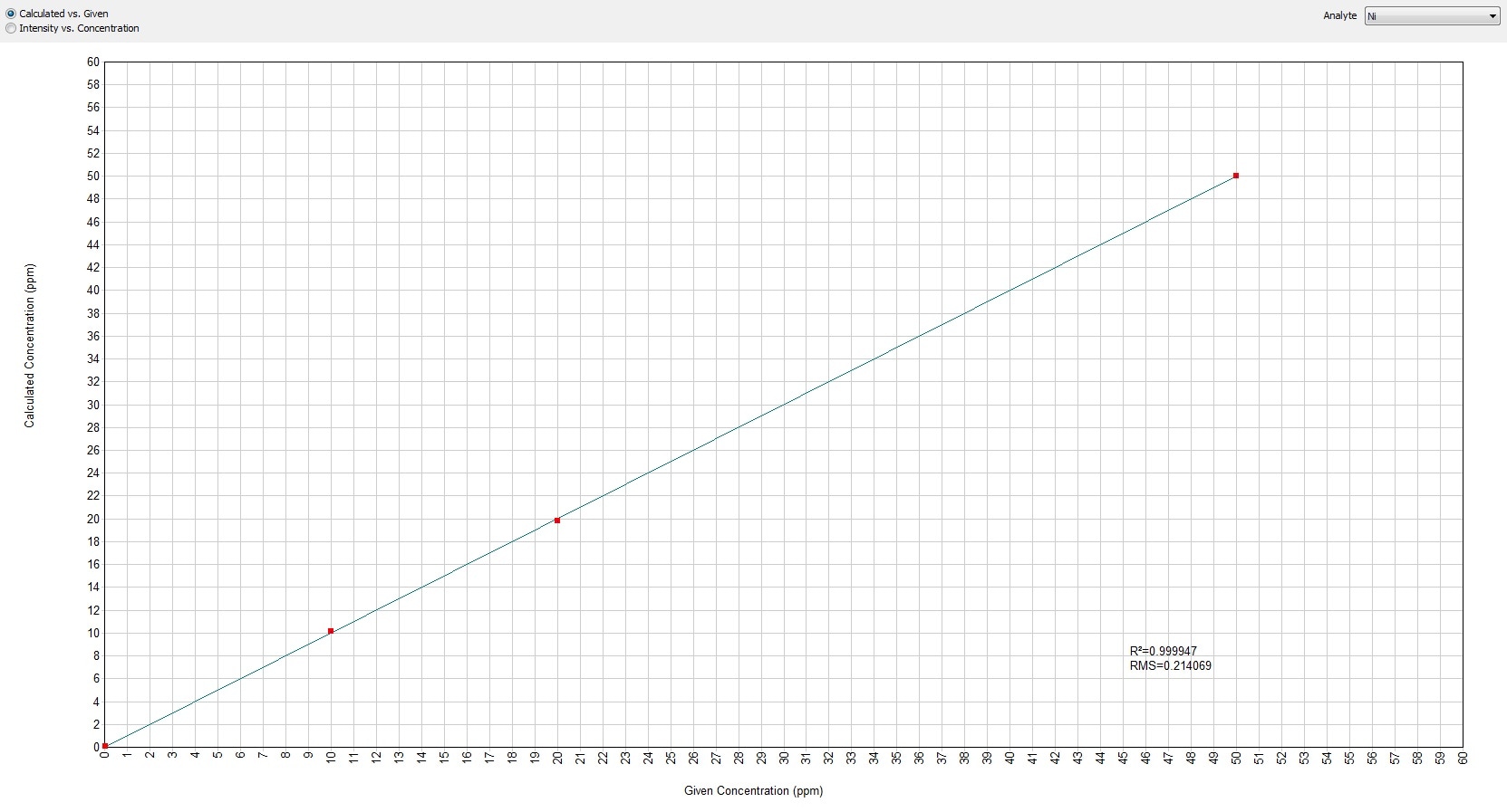 Figure 2b. Calculated versus given concentrations in the case of nickel (Ni).