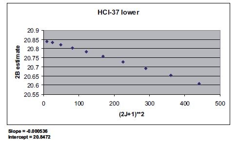 A plot of the previously determined 2B values versus (2J+1)2 will result in a straight line. The intercept will be (2B-3D) and the slope – D.