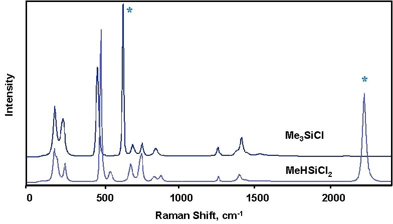 The produced chlorosilane spectra was adequately well differentiated in order to allow for measurements of each individual component and did not require multivariate modeling, despite a similar general appearance. A very strong Raman signal was produced, only requiring a few seconds to measure. Characterisation of the Si–H–containing compounds was managed due to the appearance of the hydride band, around 2200 cm–1.