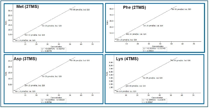 The Pegasus BT is a benchtop instrument that has the expected characteristics of a modern GC-TOFMS (i.e., robustness, chromatographic resolution, speed, etc.), but with extended linear dynamic range (105) and enhanced sensitivity (parts-per-trillion). This is clearly shown for a set of amino acids in a calibration range between 0.01 and 50 pMol/μL (Table 2). Linearity for calibration curves was excellent as apparent from the correlation coefficients for phenyl alanine aspartic acid, methionine, and lysine which ranged between 0.996 and 0.998 (Figure 2).