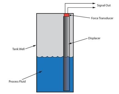 A column of solid material (the displacer) is suspended in the vessel, as shown in Figure 4. Displacers work on the Archmedes’ principle. The displacer must extend from the lowest level required to at least the highest level to be measured and the displacers density is always greater than that of the process fluid (it will sink in the process fluid).