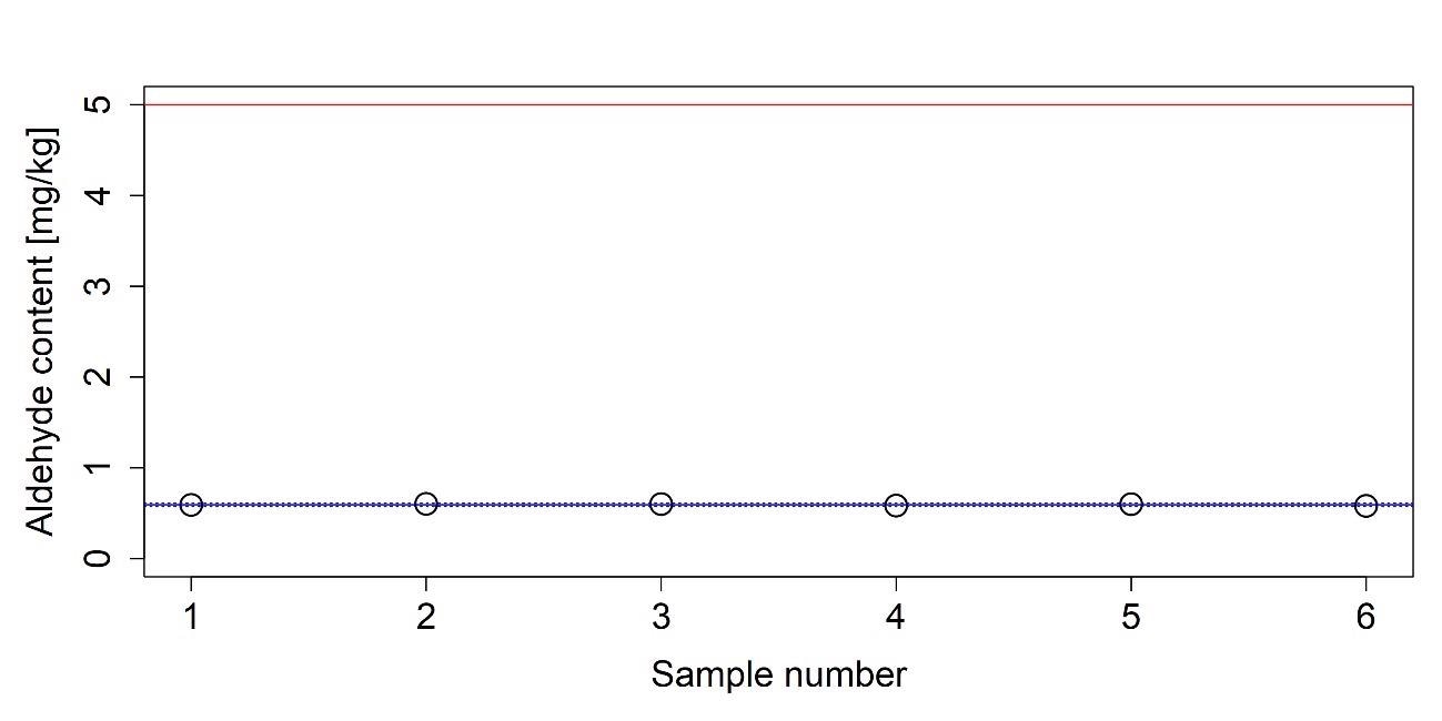 Figure 14. Measured aldehyde content of an AUS 32 sample. The average of the measured values is indicated with a solid blue line. Dashed blue lines indicate the boundaries of the 95% confidence interval and red line represents the upper limit given in ISO 22241-1. Image Credit: Mettler-Toledo Ltd