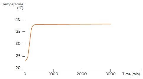The course of the test series is shown in figure 3. At the start of the experiment, the temperature of the medium is 22.8°C and the desired temperature – 37°C – is achieved after 372 minutes.