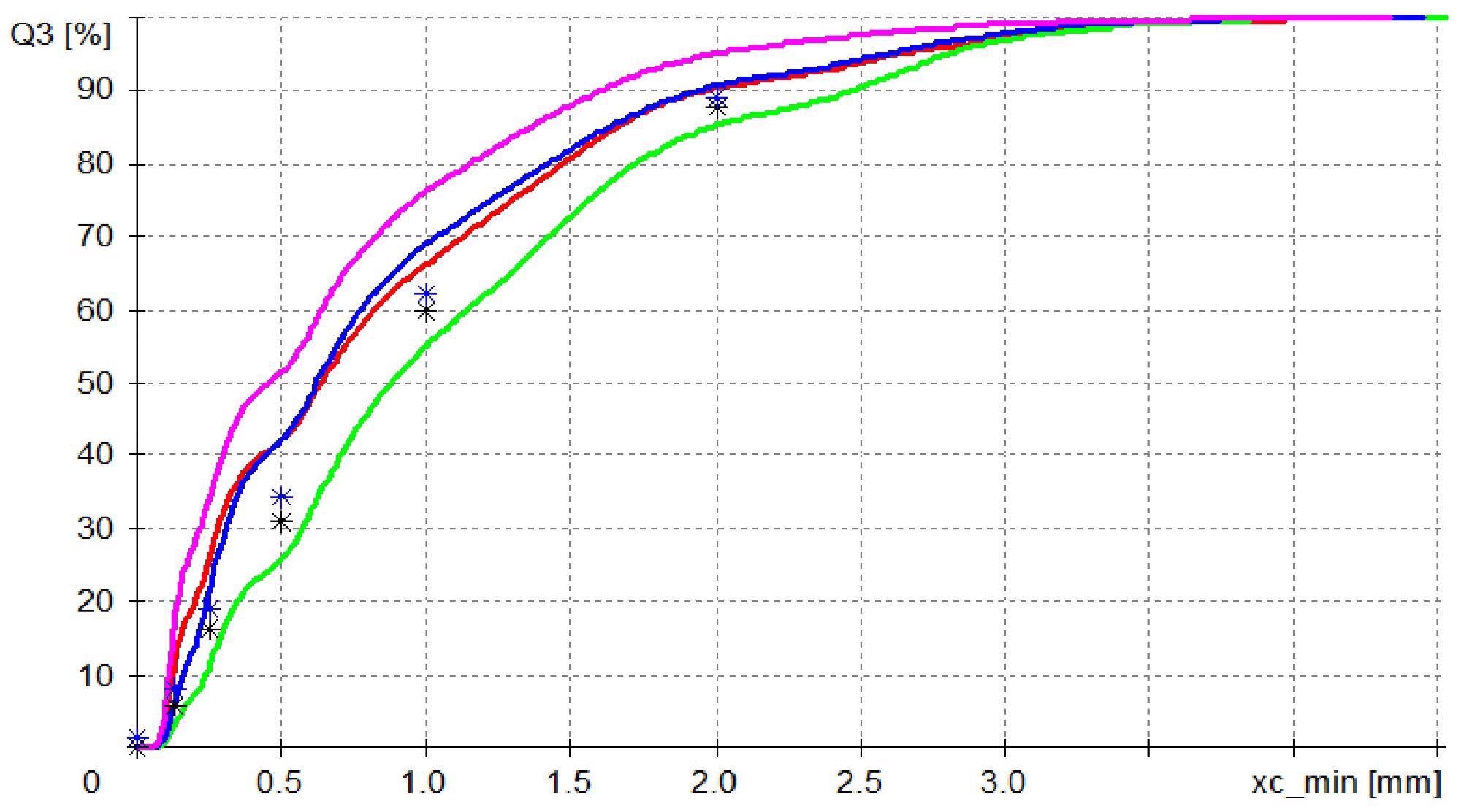 Figure 1a. Random sampling. Four measurements with the CAMSIZER P4 image analyzer (red / blue / violet / green) provide four different results. None is within the expected range (black and blue *). Image Credit: Microtrac MRB?
