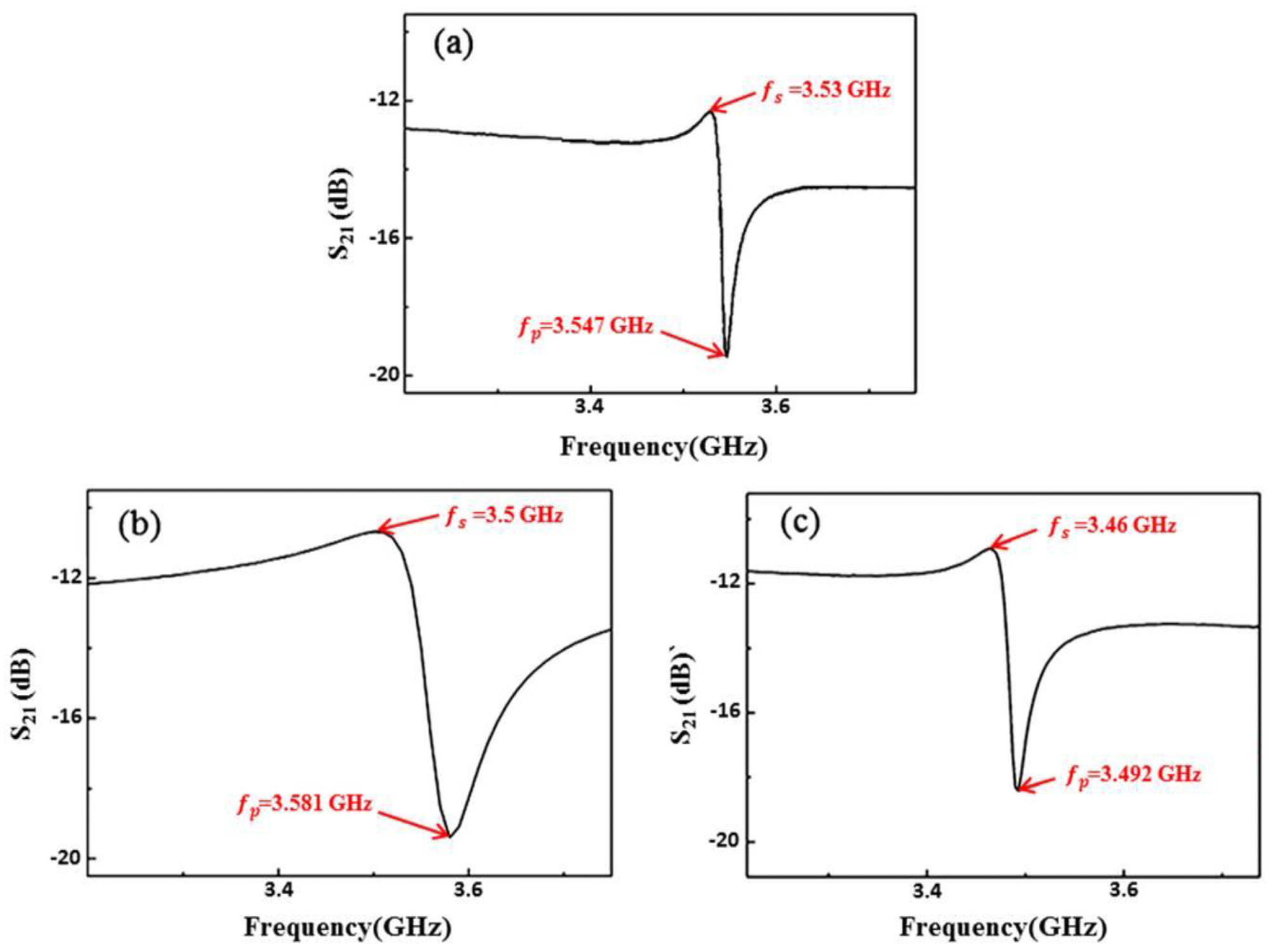 Figure 10. Frequency responses (S21) of SMR resonators using AlScN and AlN as piezoelectric layers, (a) experimental results of AlN-based resonator, (b) simulation results of AlScN-based resonator, and (c) experimental results of AlScN-based resonator. Image Credit: Coatings 2021