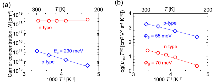 Figure 3(a) is a plot of the temperature-dependent carrier concentration in both the p-type and n-type films.