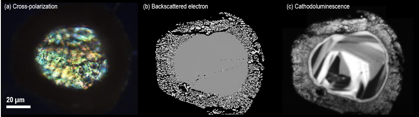 Figure 2. Images of the same zircon grain acquired using different analysis techniques; the zircon is a partially decomposed zircon in Mistatin Lake impact melt glass. The cross-polarized light microscope image (a) reveals a core and rim structure with some inhomogeneity in the central region, the backscattered electron image (b) captured using an SEM reveals a decomposed rim and core and, the cathodoluminescence image (c) reveals internal texture not observable by the other imaging techniques. Images courtesy of Michael Zanetti, Washington University in St. Louis and the McDonnell Center for the Space Sciences, Earth and Planetary Science Dept. Image Credit: Gatan Inc.
