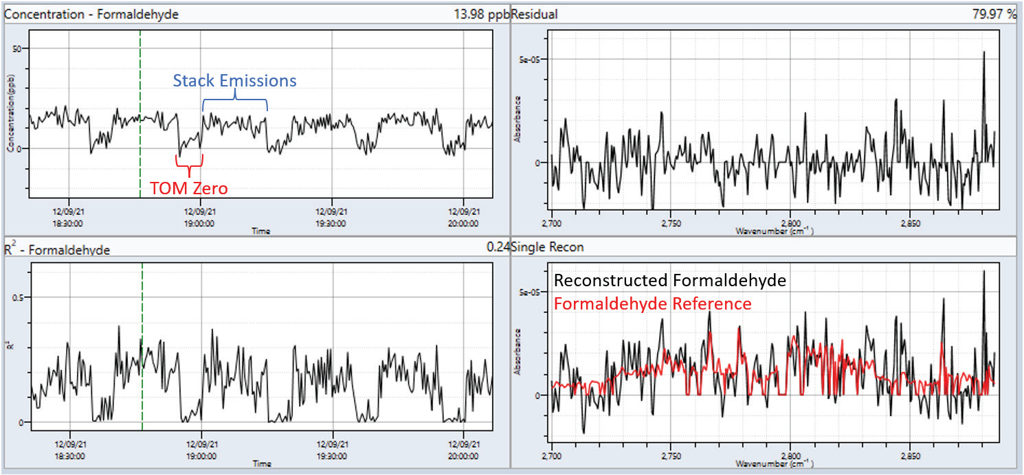 A standard deviation of 1.37 ppb on the formaldehyde measurement indicates that the minimum detection limit for this test was 4.11 ppb. The formaldehyde is visible in the regression reconstruction at a concentration of 13.98 ppb.