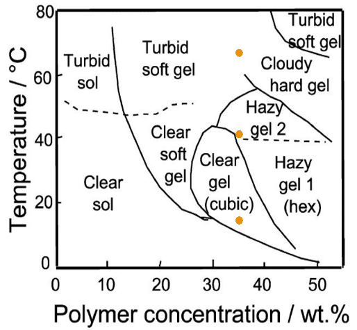 Figure 1. Phase diagram of Pluronic P123 obtained from tube inversion flow tests and visual inspection, together with structural assignments based on scattering experiments. The orange circles indicate the measuring positions of this application note. Credit: J. of Coll. Int. Sci., 2009. DOI: 10.1016/j.jcis.2008.09.054. Image Credit: Xenocs