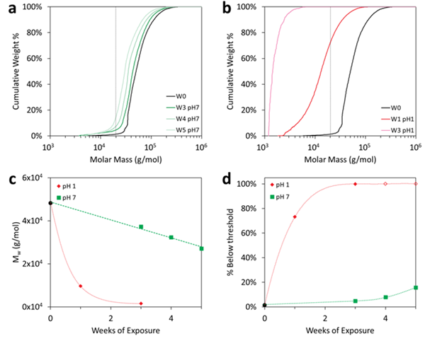 Figure 1. Characterization of PDO suture after degradation. (a) Exposed to pH7 (neutral condition); cumulative weight distribution. (b) Exposed to pH 1 (acidic condition); cumulative weight distribution. (c) Mw of polymer as a function of exposure time. (d) Weight fraction below threshold as a function of degradation time. Lines added for emphasis. Image Credit: Waters | Wyatt Technology