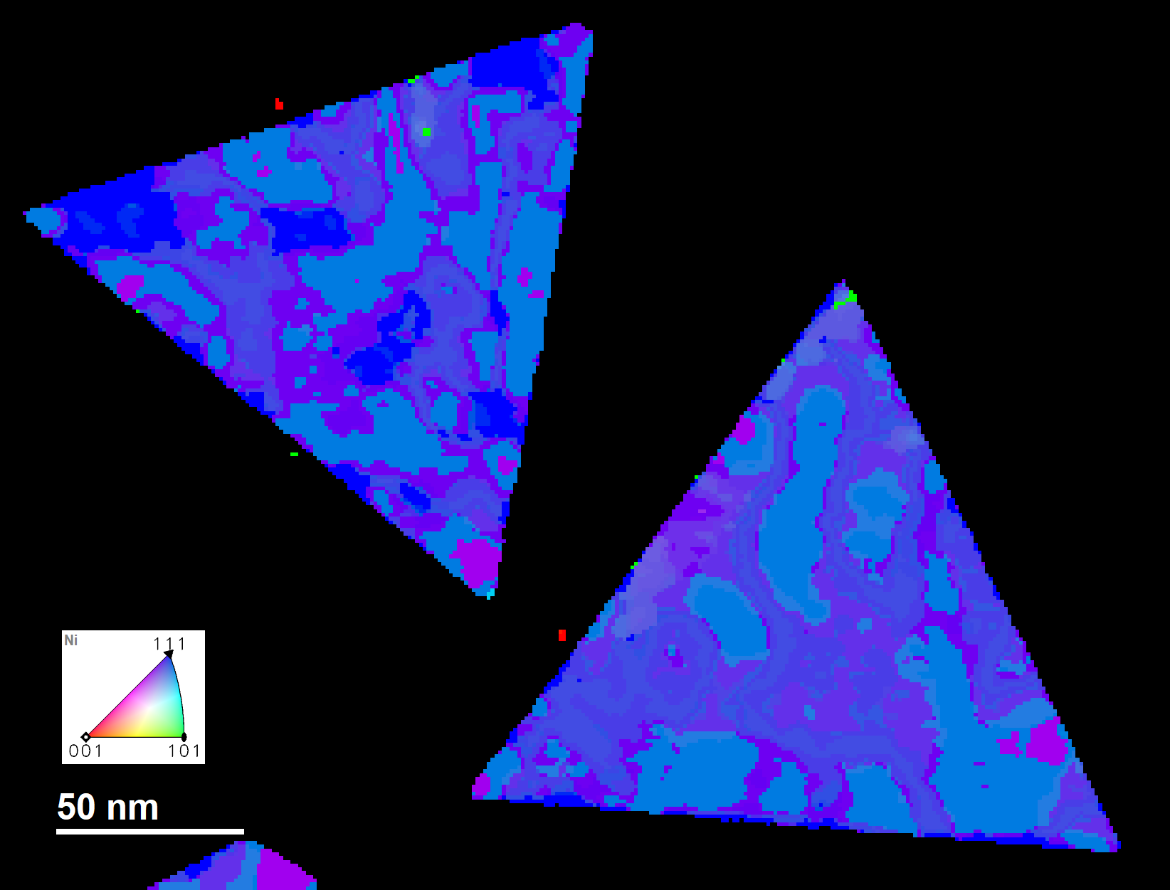 High-resolution orientation map of Ni platelets calculated with STEMx OIM (sample fabricated by Felipe Quiroga-Suavita, LPCNO - INSA Toulouse and SMS - UNSW Sydney, EU MSCA-AUFRANDE)