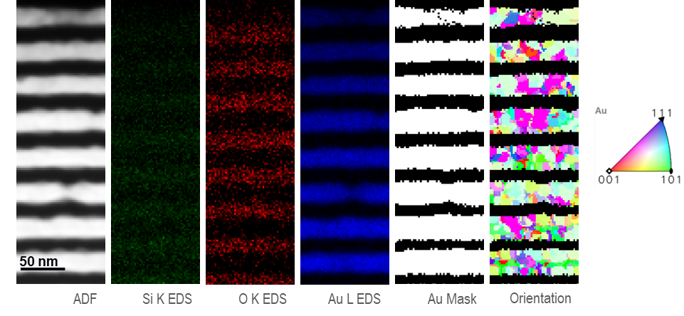Multimodal analysis of SiO2/Au multilayer film. 4D STEM and EDS data were simultaneously acquired, and the Au EDS map was used for isolating the Au layers for orientation mapping with STEMx OIM.