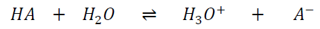 Acids are proton donors, while bases are proton acceptors.2 Two molecules, differing by a single proton, are defined as a conjugated acid-base pair. The equilibrium constant of the reaction serves as a parameter to describe the strength of an acid or base. For instance, the acid HA dissociates in water as shown in Equation 1: