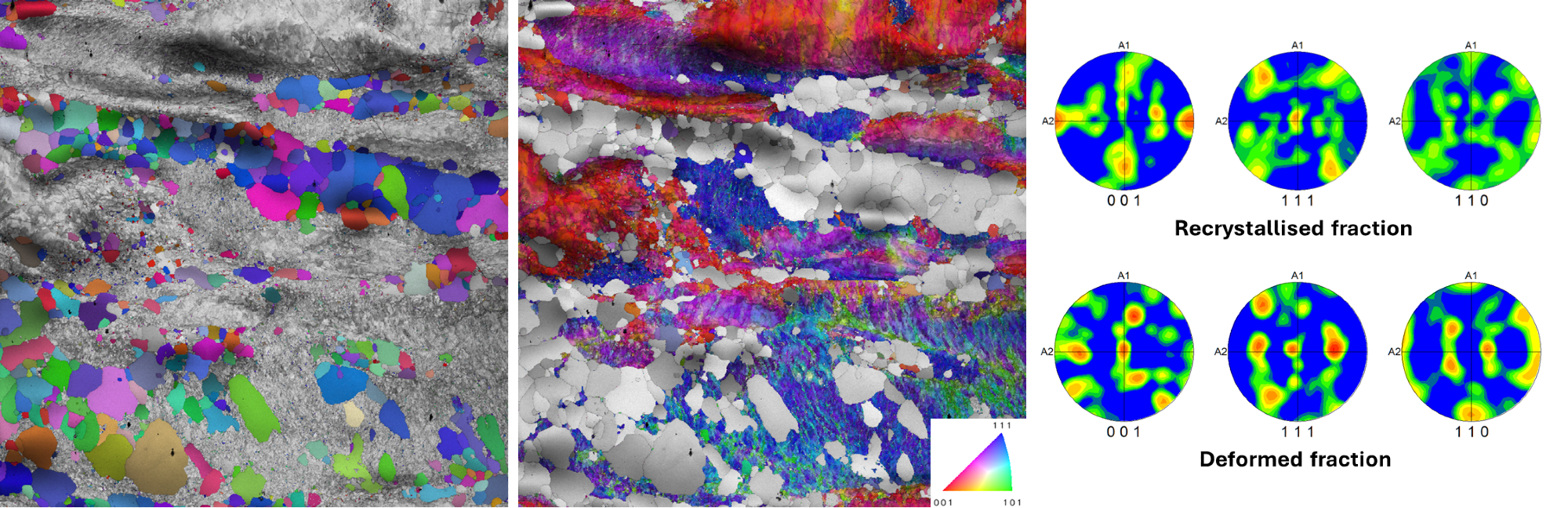 IPF orientation maps of (left) recrystallized and (center) deformed regions overlaid on grayscale image quality (IQ) maps with (right) corresponding pole figures, showing the crystallographic texture of both components. Image Credit: Gatan, Inc.