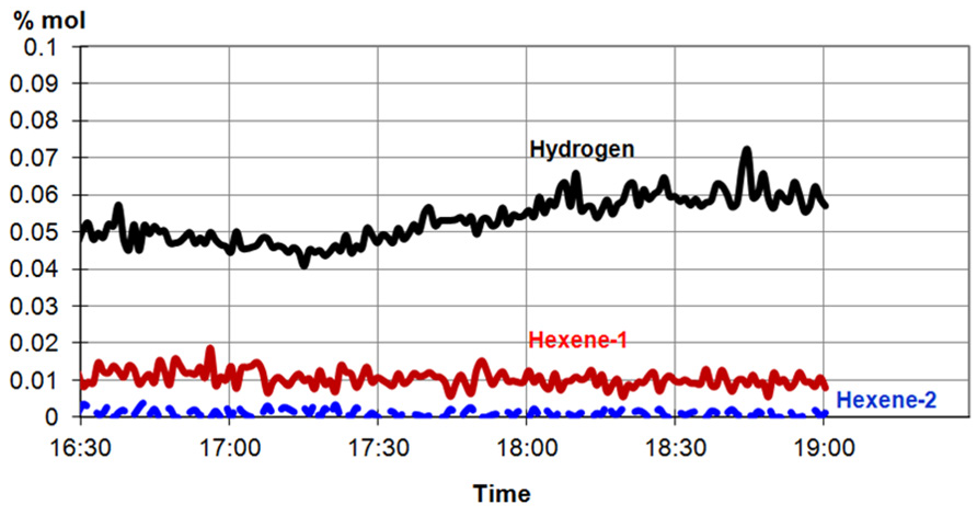 A similar effect can be seen with α-olefins such as 1-butene and 1-hexene, which are used in PE polymerization experiments to produce the required polymer grades. During production, these key components are depleted, but they can be regulated at a consistent ratio proportional to C2H4 by controlled introduction based on online analysis.