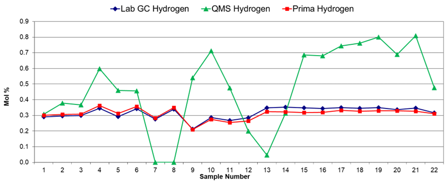 Figure 3. Hydrogen data from lab GC, quadrupole MS and Prima series process MS systems. Image Credit: Thermo Fisher Scientific – Environmental and Process Monitoring Instruments