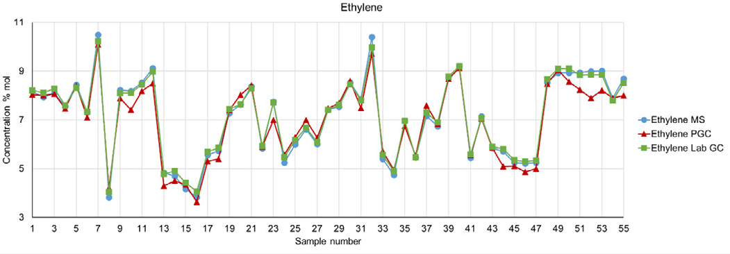 Comparison can also be made between the Prima series process MS and process GC when the subject molecule is ethylene. Figure 4 gives a data set of 55 analysis points from the lab GC and both the MS and process GC. For consistency, the MS only samples at the same rate as the GCs, but MS can provide data at a much faster rate if needed.