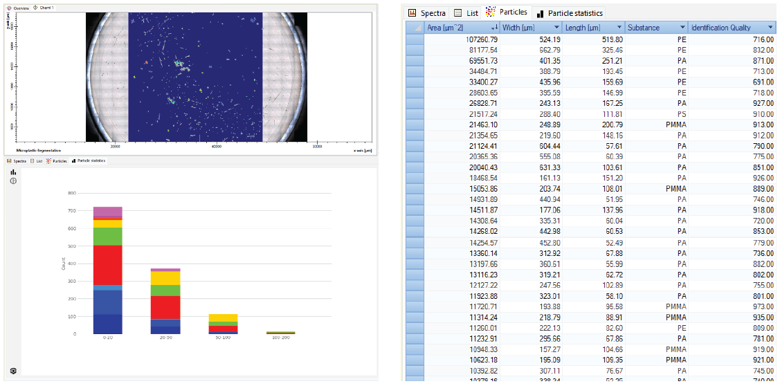 Regardless of the chosen method, the underlying principle remains the same: microplastics are treated as individual particles. Spatially resolved spectroscopy provides chemical identification together with size and shape information, allowing researchers to characterize real particle populations. After the spectroscopic data has been acquired, automated and AI-driven software creates extensive particle statistics and reports.