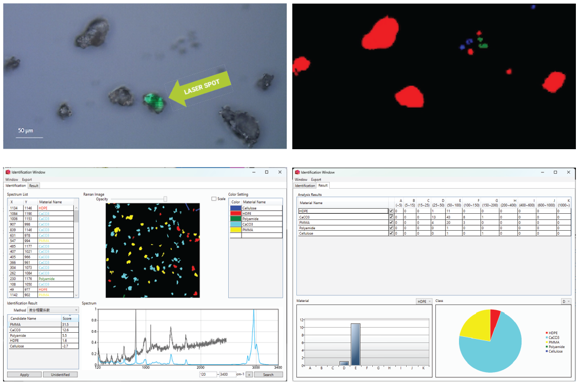 With special Raman microscopes, users can rapidly “flash” the laser across the complete particle surface (top left), creating a representative average Raman spectrum instead of acquiring only a single measurement point, creating a real-time chemical map (top right). At the bottom, particle evaluation and software output are shown, along with the complete Raman image and according spectra, as well as particle statistics like identity and size (right). Image Credit: Bruker Optics