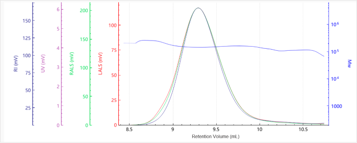 The baselines were flat with excellent signal quality and minimal noise. It was noted that molecular weight profiles varied only slightly with elution volume, highlighting the presence of narrow molecular weight distributions.