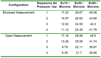The results obtained for a typical powder-coating sample are shown in table 1. As can be seen, there is a significant difference between the results obtained with and without the air cell in place, with the measurement made without the air cell being shifted towards finer particles sizes. This is exactly what would be predicted on the basis of velocity biasing. Note that the difference between the two sets of results becomes more pronounced as the dispersion pressure increases. This is because the particle velocities are much higher at high pressures.