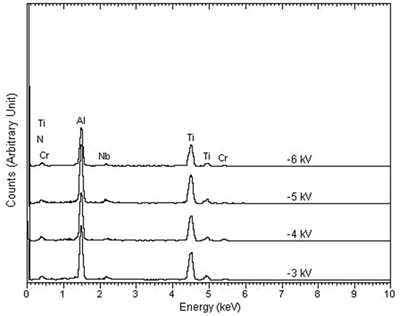 Introduction The γ-TiAl alloys have gained a lot of interest in recent years. They are considered for use in aerospace applications such as aircraft, space satellites, missiles, turbine blades, engine valves and turbocharger rotors due to the high temperature strength, low density, high melting point and creep resistance at high temperatures [1-7]. The two major disadvantages for the alloys are the limited ductility at room temperature and poor surface properties at high temperature [2-5]. The limited ductility can be improved by the addition of alloying elements such as Nb, Cr, Mn, Mo, W, Ta and V [5]. The surface properties can be improved by surface modification [3, 5]. TiN coatings have been widely applied to improve hardness and wear resistance for many applications. There are many processes for coating the films. They are the physical vapor deposition (PVD) [8, 9], chemical vapor deposition (CVD) [10,11], plasma deposition [2, 12-14], cathodic arc (CA) [15-18], ion implantation [19] and direct metal-gas reaction [3,4,20]. Plasma deposition is the clean technology and is selected for this research. Experimental Alloys The alloys used for the nitridation are MJ12 and MJ47 and the compositions are listed in Table 1. They were provided by Howmet Corp. (Whitehall, MI, U.S.A.) as rods with 15.5 mm diameter and cut into the disks of 1-2 mm thick. The disks were polished down with 0.3 micron alumina powder and degreased with alcohol. Table 1. Nominal composition (at%) of the alloys | | | MJ12 | Balance | 47 | 2 | 2 | - | - | | MJ47 | Balance | 47 | 2 | - | 2 | 0.8 | Plasma System The inductively coupled plasma system used for the nitridation consists of RF power generator (Dressler model HPG 1365) discharge at 13.56 MHz in order to avoid interference from public communications [21]. The generator is connected to an antenna through a matching network and the operating power was at 150 and 250 W. The multicusp plasma chamber is made of stainless steel with 31.2 cm diameter, 42.5 cm length and 6.0 mm thickness. The external surface of the chamber is embedded with the permanent magnet buttons [22]. Nitridation The specimen was placed in the multicusp chamber. The air was evacuated to the pressure of 0.05 mtorr and argon was fed into the chamber to 0.5 mtorr. The generator was discharged at 13.56 MHz, 150 W. The –1 kV bias voltage was supplied for 7 min to clean the surface of the specimen and turned off. Then, the argon was evacuated to 0.05 mtorr and nitrogen was fed into the chamber to 0.5 mtorr. The generator was operated at 250 W and the nitridation proceeded for 1 h using the bias voltages of –3, -4, -5 and –6 kV. At the end of the process, the power of the generator, the bias voltage and the nitrogen gas were turned off. The air was fed into the chamber until the pressure was 1 atm and the specimen was brought for further analysis. Characterization By using 1 gf load and 5 s dwelling time, Knoop hardness of non-nitrided and nitrided alloys was measured ten times and the average value and the standard deviation were calculated. In addition, wear rates of the alloys were determined using a pin-on-disk wear tester. The parameters for the test are the following : | Pin | 3.175 mm radius WC ball (r) | | Load | 50 gf | | Wear track radius (R) | 4.0 mm | | Sliding velocity | 4.00 cm.s-1 | | Sliding distance | 20 m | | Lubricant | dry | | Temperature | 25oC | | Atmosphere | ambient air | The width of the wear track was measured by optical microscopy and the volume loss of the alloys was calculated using standard geometrical formulae, Disk volume loss =  where d = the width of the wear track. The volume loss per unit distance or wear rate was then determined. The nitrided alloys were analyzed using a scanning electron microscope and an energy dispersive x-ray analyzer operated at 15 kV. The nitrided alloys were analyzed using an x-ray diffractometer as well. The operating parameters were 45.0 kV, 35.0 mA and Cu-Kα as the target. Results and Discussion During the nitridation, nitrogen molecules decomposed to atoms. Some of the atoms further decomposed to ions and electrons. Some were left as atoms. The electrical charge of the ions is controlled by the power of the generator. Due to the negative voltage supplied to the specimen, the positive ions in the chamber were accelerated to the plasma-specimen interface. The energy (E) of the positive ions at the interface is E = qV Where: q = the electrical charge of the ion and V = the negative voltage. The positive ions with high energy penetrated into the alloy matrix and were resisted by the repulsive force of the host atoms on the specimen. The ions were embedded inside the matrix at some depth beneath the interface. But for the electrons, they were accelerated to the ground wall of the chamber. The surface of the specimen contains more defects and the disorder of the atoms is increased. From a thermodynamic point of view, the entropy of the system is increased. Some of the ions can form new phase(s) with the host atoms as well. The ordering of the atoms and the new phase(s) formed are able to play the role to hardness and wear resistance. The elemental spectra of nitrided MJ12 and MJ47 are shown in Figure 1. There are Ti, Al and Nb on both of the alloys. The additional Cr and Mn were detected on MJ12 and MJ47, respectively. No B was detected on MJ47 because of its light atomic mass. The results are consistent with the compositions of the alloys shown in Table 1. During the nitridation, nitrogen molecules decomposed into atoms and ions. The ions penetrated and embedded in the alloy surfaces. The additional nitrogen was detected on the two alloys. No nitrogen was detected on wear tracks showing that the deposited film is very thin. No tungsten worn from the WC ball was detected inside wear tracks showing that the concentration of the worn tungsten from the ball was very low. During the nitridation, some of nitrogen embedded in the alloy matrix 