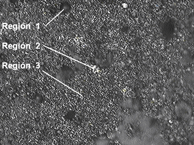 Introduction Sialons are ceramics phases occurring in the SiO2 – Si3N4 – AlN – Al2O3 system. Due to their chemical inertness, good thermal shock resistance, and excellent mechanical properties retained up to high temperatures, sialon systems have found considerable applications in engineering [1]. They can have a wide range of compositions, the more commonly encountered forms of sialon being β-sialon, O-sialon, X-sialon, and α-sialon. β-sialon is Si6–zAlzOzN8–z, where z can have values from 0 (pure Si3N4) to 4.2. These sialons are isostructural with β-Si3N4. O-sialon is Si2 – xAlxO1+xN2 – x, where x can have values from 0 to about 0.4. X-sialon, nominally Si12Al18O39. These sialons are isostructural with mullite, and can be regarded as solid solutions of mullite with Si3N4. α-sialon is isostructural with α-Si3N4 and can be formed in the presence of stabilizing metal ions as Mg, Y or Ca [1]. Sialons are almost never found as natural minerals and sialon powders must be synthesized. Sialons can be made by reaction sintering or hot pressing a starting powder mixture of oxide, nitride and oxynitride powders [1, 2]. They can also be made using of a carbothermal reduction process (CTR) [3, 4]. On the other hand, reactive dc magnetron sputtering is a technique that allows the development of various types of coatings. These coatings can be pure metallic and non-metallic, metallic oxides, metallic nitrides and metallic carbides; with very varied structures and properties [5]. There are few reports in the literature on the manufacture of coatings from the quaternary Si-Al-O-N system [6]. In this work we report studies on coatings from this system, using different techniques to characterize their structure and chemical composition. Experimental Coatings from the Si – Al – O – N system were prepared using DC magnetron reactive co-sputtering technique (Sputtering INTERCOVAMEX system) on high speed steel (HSS) substrates. A cylindrical aluminum tablet of 5.0 cm diameter was used as the target, which was covered partially with pieces of c-Si, so that Si:Al fractions 50:50 and 60:40 in area were defined. Argon was used as the like inert gas (99.999% purity), and oxygen and nitrogen (99.999% and 99.5% purity, respectively) as the reactive gases. Optical emission spectroscopy (OES) was performed during the growth processes of the coatings, in order to detect the involved species in the plasma (optical fiber spectrometer Ocean Optics 2000). The resultant coatings were analyzed by scanning electron microscopy (SEM) (PHILIPS EDAX XL30 ESEM). Additionally, analyses of chemical composition by energy dispersive spectroscopy (EDS) were performed for each sample. Structure was studied by X-ray diffraction (XRD, Rigaku D/Max-2100). Micro-Raman dispersion spectra were obtained using a DILOR Spex system, working with the He-Ne excitation line at 632.8 nm. The parameters used in the growth process of the coatings obtained are listed in Table 1. Table 1. Growth parameters of reactive DC magnetron sputtering system for the Si-Al-O-N system. | Coating | | SO3N10B0 | 60 | 25 | 3 | 10 | 1.0 x 10-1 | 35 | 0 | | SO3N12B0 | 60 | 25 | 3 | 12 | 1.0 x 10-1 | 33 | 0 | | SO0N20B0 | 60 | 20 | 0 | 20 | 8.8 x 10-2 | 30 | 0 | | SO0N20B-300 | 60 | 15 | 0 | 20 | 7.6 x 10-2 | 35 | -300 | | SO0N18B-300 | 60 | 18 | 0 | 18 | 8.0 x 10-2 | 30 | -300 | | SO0N20B-250 | 50 | 15 | 0 | 20 | 1.2 x 10-1 | 30 | -250 | Results and Discussion The objective of this work was to develop a production method for coatings from the Si-Al-O-N system by means of the reactive DC magnetron sputtering technique. Coatings were obtained by varying growth parameters (Table 1), allowing us to evaluate the effect on structure and composition of the samples. The EDS chemical compositions of each of the obtained coatings are listed in Table 2. Table 2. Chemical composition of the coatings samples obtained by EDS measurements. | Coating | | SO3N10B0 | 25.51 | 13.03 | 61.45 | 0 | | SO3N12B0 | 28.51 | 10.41 | 61.08 | 0 | | SO0N20B0 | 40.69 | 4.48 | 51.78 | 3.05 | | SO0N20B-300 | 35.70 | 8.30 | 49.08 | 6.92 | | SO0N18B-300 | 42.29 | 4.85 | 47.66 | 5.20 | | SO0N20B-250 | 40.30 | 3.89 | 49.36 | 6.45 | It is seem that the bias voltage in the substrate aids nitrogen incorporation. Without bias voltage and with a nitrogen flow of 20 sccm, a coating contains 3.05 at.% of nitrogen; on the other hand, 6.45 and 6.92 at.% of nitrogen content are obtained, respectively, when bias voltages of -250V and -300V are applied. Nevertheless, the application of high negative bias voltages to the substrate produces strong erosion of the coating (Figure 1).  Figure 1. Scanning electron microscopy image of SO0N20B-250 coating obtained using a -250 V bias voltage on the substrate. When bias is not applied, no erosion of the surface is observed in Figure 2.  Figure 2. Scanning electron microscopy image of SO0N20B0 coating obtained without bias voltage on the substrate. The optical emission spectrum of sample SO0N20B-250 (Figure 3) shows the following species: Ar(I), which are the most remarkable lines; N2, N2+, N(I), Al(I) and Si(II), at 375 nm, 391nm, 868 nm, 394 nm and 637 nm, respectively [7, 8].  Figure 3. Optical emission spectrum obtained during evaporation of SO0N20B-250 coating. Figure 4 shows OES spectra of the co-sputtering process with an aluminum-silicon target. All curves show characteristic peaks of Argon (20 sccm); the bottom curve is due to a process with a pure argon atmosphere, where we can clearly see the signal of aluminum (396 nm). The other curves were obtained introducing different fluxes of nitrogen (5, 10, and 15 sccm) in the chamber vacuum in addition to argon. We can observe the nitrogen peaks (N2, N2+ and N (I)) increasing and a reduction in the argon peaks when the nitrogen flux increases. We observe also that there is no effective aluminum erosion (absence of the Al peak) when nitrogen flux is introduced into the vacuum chamber, which can be du
