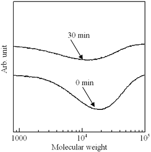 In addition, the GPC measurement of the p(TDMA-tBVPC56) cast film was carried out to confirm the molecular weight change during the deep UV irradiation. As clearly shown in Figure 8, the molecular weight decreased with irradiation time, and the curve became broader, indicating that the molecular distribution is larger than that of the initial state. These findings suggest that the main chain scission also takes place.