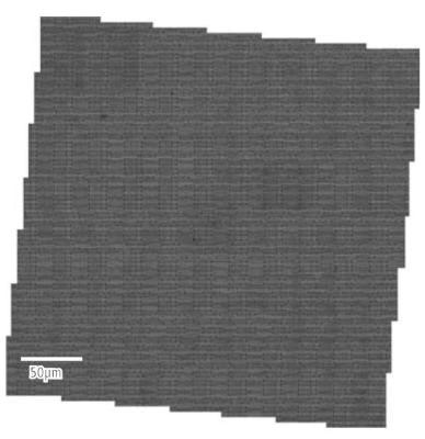 The mosaic consists of 49 images, each ~500 Megapixels, automatically stitched by the VE-Viewer into a ~1/3 mm x 1/3 mm mosaic. This mosaic was acquired stepping at an angle, with scan rotation used to align image features to the scan axes, in order to accentuate the stitching for illustrative purposes.