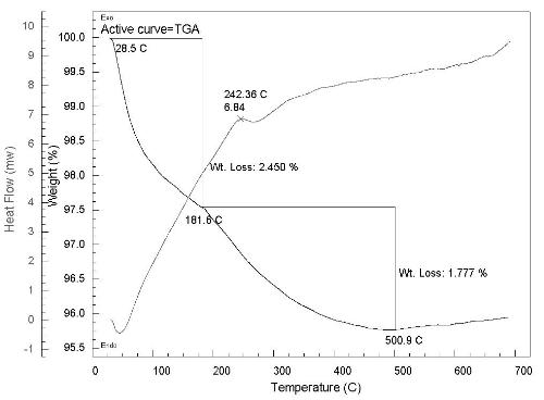 Fig. 1 shows an X-ray diffraction pattern of the Ru doped TiO2 particles as a function of reaction temperature. From the X-ray analysis, synthesized particles reveals the coexistence of anatase (JCPDS number 84-1286) and rutile (JCPDS number 01-1292) phases in the reaction temperature from 170°C to 210°C for 6 h. The intensity of rutile phase on Ru doped TiO2 particles increased with increasing reaction temperature. The amount of rutile phase on the synthesized particles increased with decreasing Ru concentration in solution because the less a content of the transposition metal, the easier to phase transition in the same temperature condition. The TEM microstructure of the synthesized Ru doped TiO2 particles as a function of reaction temperature is shown in Fig. 2. The average size of the synthesized Ru doped TiO2 particles increased with reaction temperature increased from 170°C to 210°C. Microstructure of synthesized particles shows a small particles size about 10-60nm and size distribution was unclear and broad. The Fig. 3 shown the spectrum of Ru doped TiO2 nanoparticles by TEM–EDS analysis. The peak of titanium, Ru and oxygen shows on the spectrum. From the TG-DTA analysis (Fig. 4) of Ru doped TiO2 nanoparticles, the overall reduction in weight was about 4.2% up to ~700°C and water of crystallization was dehydration at 242°C. Also it shows that transition of phase from anatase to rutile at almost 561°C. Specific Surface Area of synthesized particles as a function of Ru concentration in TiO2 by combination of a sol-gel and a hydrothermal process. BET surface areas of synthesized particles by a hydrothermal process were found to be larger than that of pure TiO2 from synthesized by a sol-gel process (about 50 m2/g). The surface of synthesized particles increased with increasing Ru concentration in TiO2 sol.
