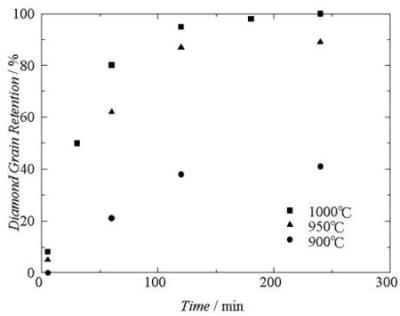 Figure 3. Diamond grain retention rate after sintering (PP) under 10 MPa for different bonding temperatures as function of temperatures.
